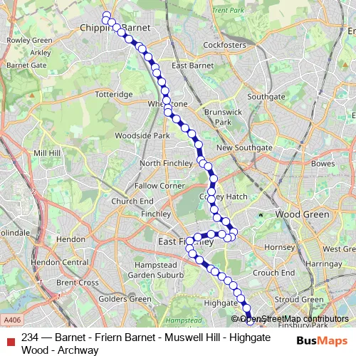 Click here to view the nearest 234 - Barnet - Friern Barnet - Muswell Hill - Highgate Wood - Archway bus stop.