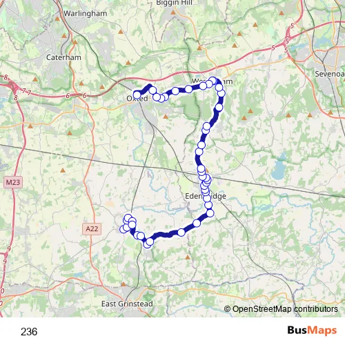 The first stop of the 236 bus route is Lingfield, War Memorial and the last stop is Oxted, Station Road East. 236 is operational during on weekdays.