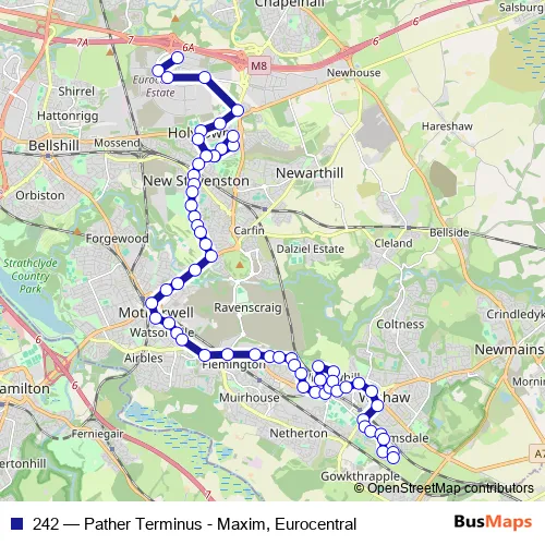 The first stop of the 242 bus route is Maxim Business Park and the last stop is Rannoch Drive. 242 (Pather Terminus - Maxim, Eurocentral) is operational during everyday.