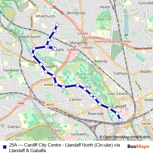 The first stop of the 25A bus route is Cardiff Bus Interchange Bay 11 and the last stop is Three Elms. 25A (Cardiff City Centre - Llandaff North (Circular) via Llandaff & Gabalfa) is operational during everyday.