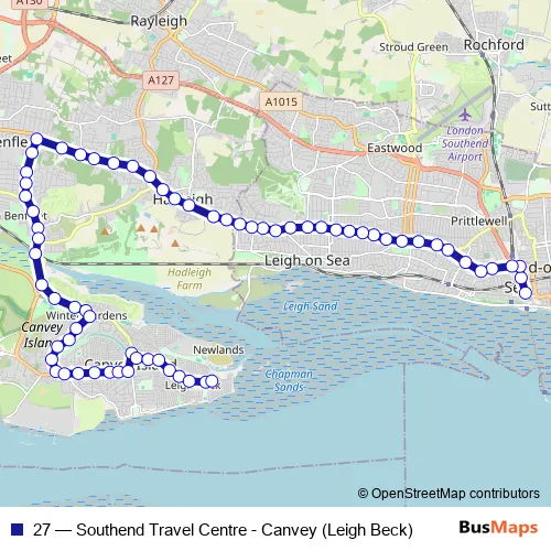 The first stop of the 27 bus route is Travel Centre and the last stop is Leigh Beck. 27 (Southend Travel Centre - Canvey (Leigh Beck)) is operational during everyday.