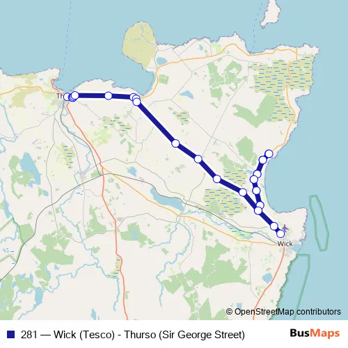 The first stop of the 281 bus route is Sir Georges Street Church and the last stop is Tesco. 281 (Wick (Tesco) - Thurso (Sir George Street)) is operational during on weekdays.
