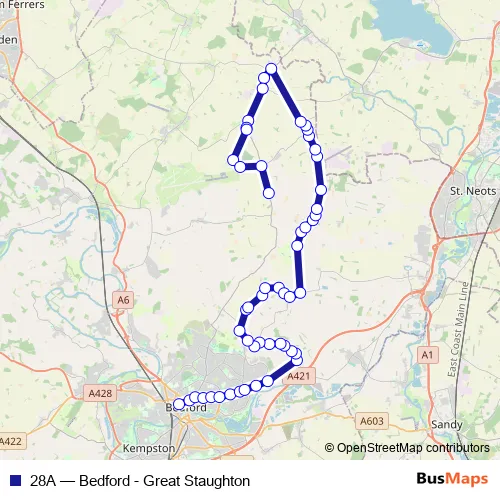 The first stop of the 28A bus route is Bus Station and the last stop is Church Lane. 28A (Bedford - Great Staughton) is operational during everyday.