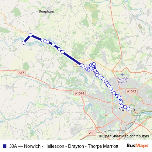 The first stop of the 30A bus route is Port Row and the last stop is Castle Meadow. 30A (Norwich - Hellesdon - Drayton - Thorpe Marriott) is operational during on weekdays.