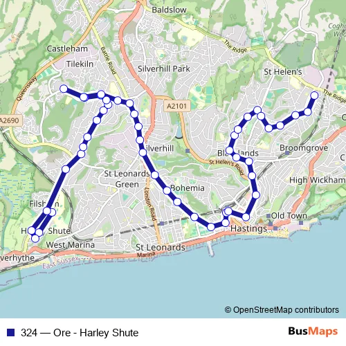 The first stop of the 324 bus route is The St Leonards Academy and the last stop is Pennine Rise. 324 (Ore - Harley Shute) is operational during everyday.
