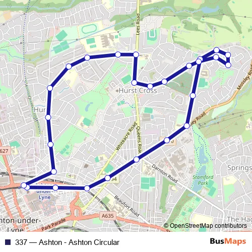 The first stop of the 337 bus route is Ashton-under-Lyne Interchange and the last stop is Ashton-under-Lyne Interchange. 337 (Ashton - Ashton Circular) is operational during everyday.