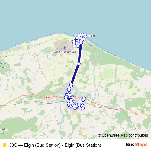 Services on the 33C - Elgin (Bus Station) - Elgin (Bus Station) bus start at 08:05 on Monday, Tuesday, Wednesday, Thursday, Friday, Saturday, Sunday.