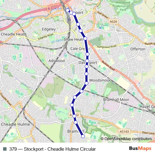 The first stop of the 379 bus route is Bramhall High School and the last stop is Stockport Interchange. 379 (Stockport - Cheadle Hulme Circular) is operational during on weekdays.