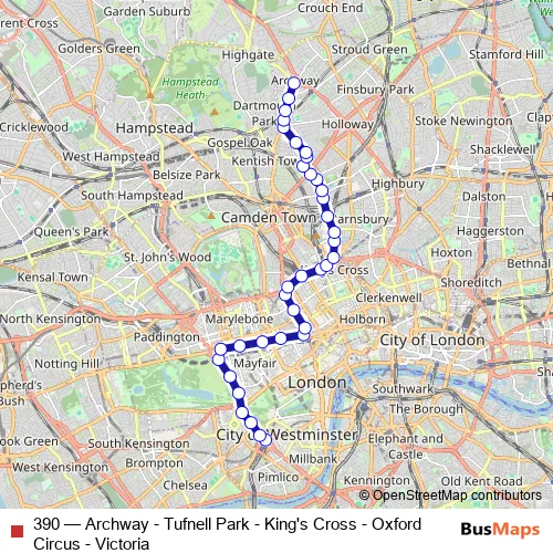 Click here to view the nearest 390 - Archway - Tufnell Park - King's Cross - Oxford Circus - Victoria bus stop.