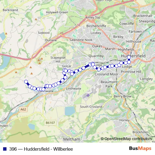 The first stop of the 396 bus route is Wilberlee and the last stop is Huddersfield Bus Station. 396 (Huddersfield - Willberlee) is operational during everyday.