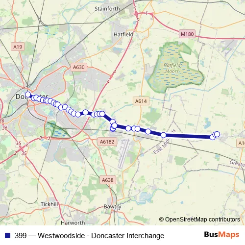 The first stop of the 399 bus route is Doncaster Frenchgate Interchange/C5 and the last stop is