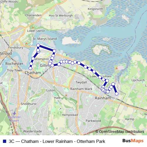 The first stop of the 3C bus route is Waterfront Bus Station and the last stop is Harwood Road. 3C (Chatham - Lower Rainham - Otterham Park) is operational during on weekdays.