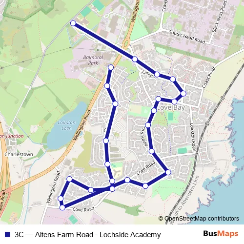 The first stop of the 3C bus route is Lochside Academy and the last stop is Balmoral Business Park. 3C (Altens Farm Road - Lochside Academy) is operational during everyday.