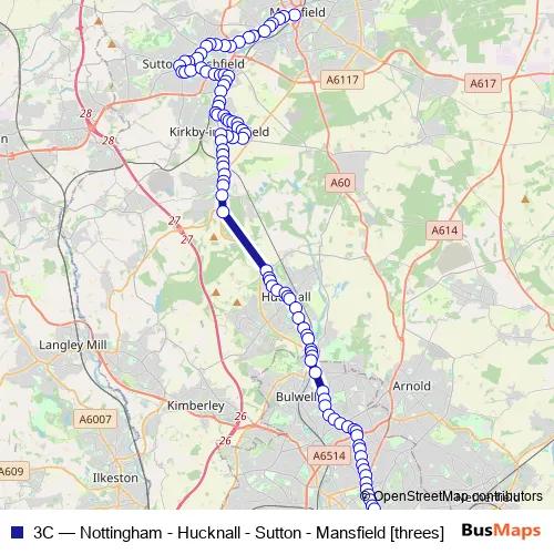 Bus 3C - Nottingham - Hucknall - Sutton - Mansfield threes: Full Schedule in Nottingham