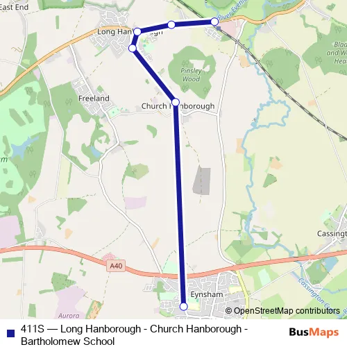 The first stop of the 411S bus route is Hanborough Station and the last stop is Bartholomew School. 411S (Long Hanborough - Church Hanborough - Bartholomew School) is operational during on weekdays.