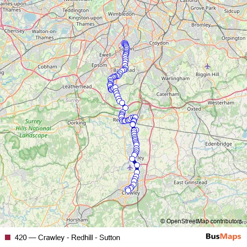 The first stop of the 420 bus route is Sutton Bus Garage and the last stop is Bus Station. 420 (Crawley - Redhill - Sutton) is operational during everyday.