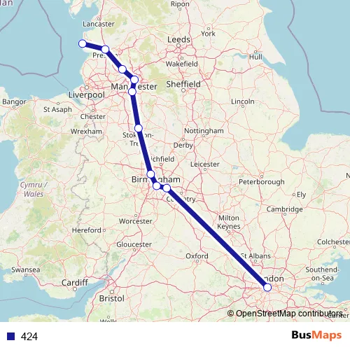 The first stop of the 424 bus route is National Express Coach Facility and the last stop is London Victoria Coach Station Arrivals. 424 is operational during everyday.