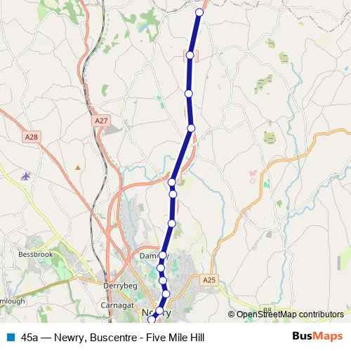 The first stop of the 45a bus route is Newry Bus Station and the last stop is Five Mile Hill. 45a (Newry, Buscentre - Five Mile Hill) is operational during everyday.