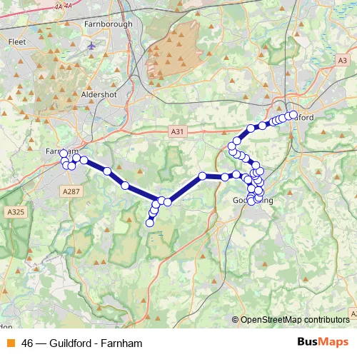 The first stop of the 46 bus route is Union Road and the last stop is Friary Bus Station. 46 (Guildford - Farnham) is operational during everyday.