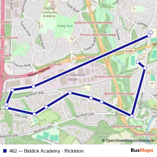 The first stop of the 462 bus route is Biddick Academy and the last stop is St Robert Of Newminster Catholic School. 462 (Biddick Academy - Rickleton) is operational during on weekdays.