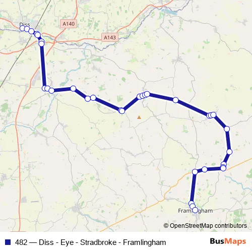 The first stop of the 482 bus route is Bus Station and the last stop is Shelter. 482 (Diss - Eye - Stradbroke - Framlingham) is operational during everyday.