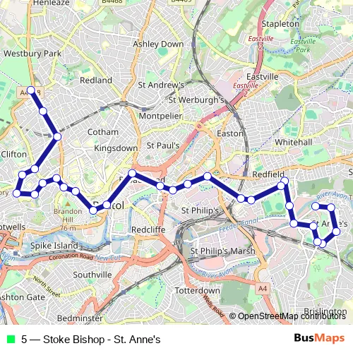 The first stop of the 5 bus route is Chapel Way and the last stop is Black Boy Hill. 5 (Stoke Bishop - St. Anne's) is operational during everyday.
