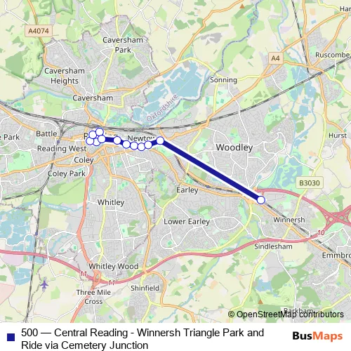 The first stop of the 500 bus route is Minster Street and the last stop is Winnersh Triangle Railway Station. 500 (Central Reading - Winnersh Triangle Park and Ride via Cemetery Junction) is operational during everyday.