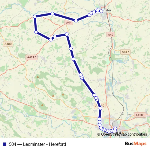 The first stop of the 504 bus route is Railway Station and the last stop is Bus Station. 504 (Leominster - Hereford) is operational during everyday.