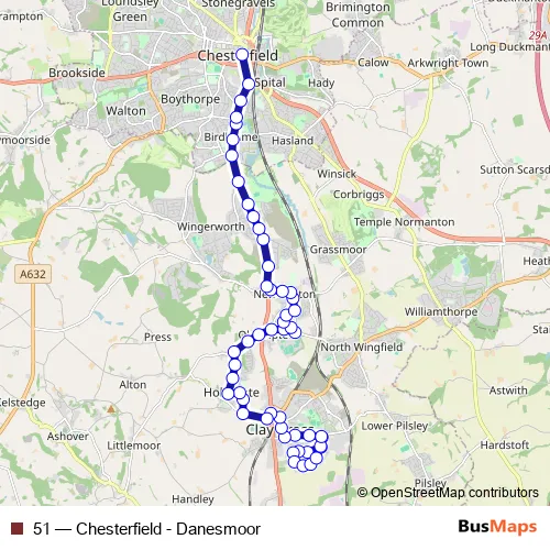 The first stop of the 51 bus route is 75 Cemetery Road and the last stop is Church Way. 51 (Chesterfield - Danesmoor) is operational during everyday.