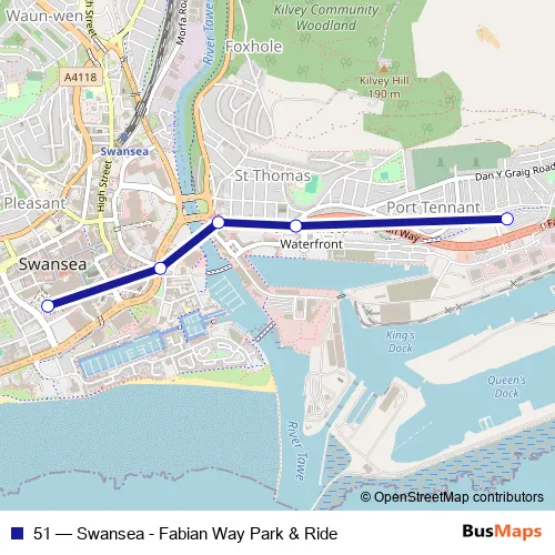 The first stop of the 51 bus route is Fabian Way Park & Ride and the last stop is Swansea Bus Station Stand D. 51 (Swansea - Fabian Way Park & Ride) is operational during everyday.