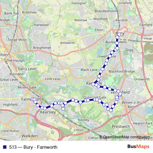 The first stop of the 513 bus route is Farnworth Bus Station and the last stop is Bury Interchange. 513 (Bury - Farnworth) is operational during everyday.