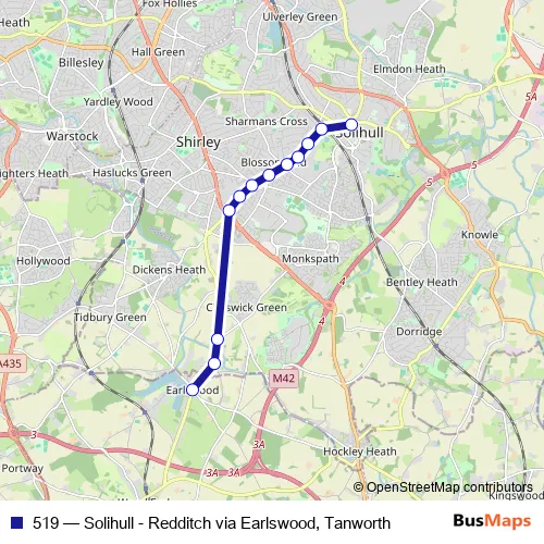 The first stop of the 519 bus route is Solihull Town Centre and the last stop is Reservoir Hotel. 519 (Solihull - Redditch via Earlswood, Tanworth) is operational during everyday.
