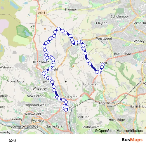 The first stop of the 526 bus route is Shelf, Village Hall and the last stop is Halifax, Market Street. 526 is operational during everyday.