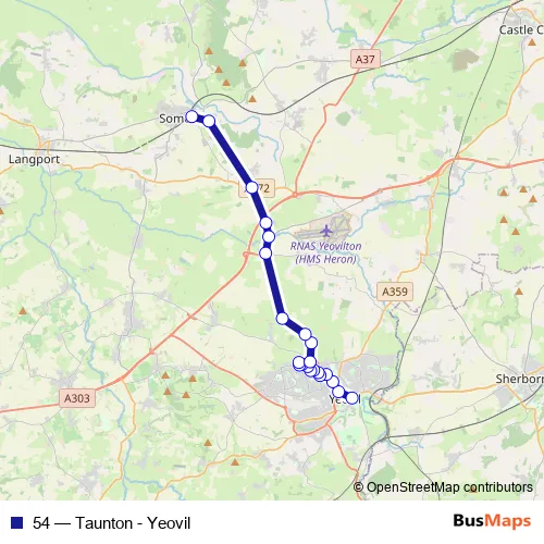 The first stop of the 54 bus route is Bus Station and the last stop is White Hart. 54 (Taunton - Yeovil) is operational during everyday.