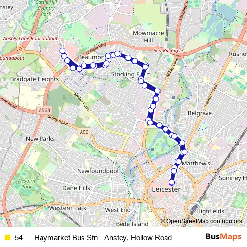 The first stop of the 54 bus route is Haymarket Bus Station and the last stop is Haymarket Bus Station. 54 (Haymarket Bus Stn - Anstey, Hollow Road) is operational during everyday.
