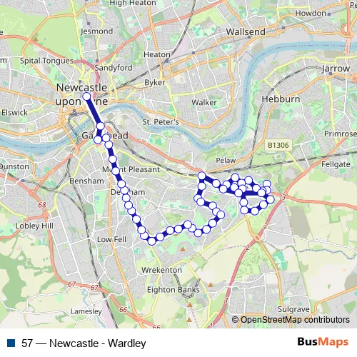 The first stop of the 57 bus route is Wardley Lane and the last stop is Monument Market Street. 57 (Newcastle - Wardley) is operational during everyday.