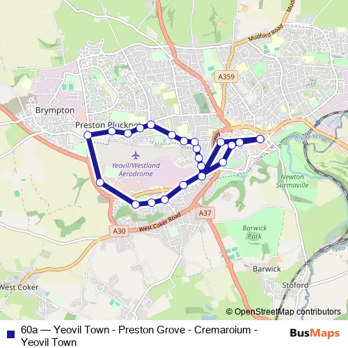 The first stop of the 60a bus route is Bus Station and the last stop is Bus Station. 60a (Yeovil Town - Preston Grove - Cremaroium - Yeovil Town) is operational during everyday.
