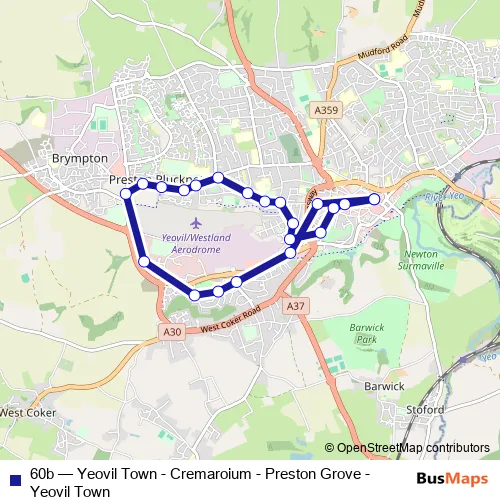 The first stop of the 60b bus route is Bus Station and the last stop is Bus Station. 60b (Yeovil Town - Cremaroium - Preston Grove - Yeovil Town) is operational during everyday.