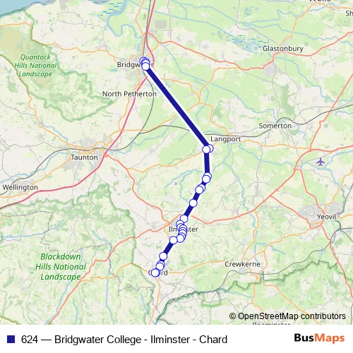 The first stop of the 624 bus route is Bridgwater College and the last stop is The Guildhall. 624 (Bridgwater College - Ilminster - Chard) is operational during on weekdays.