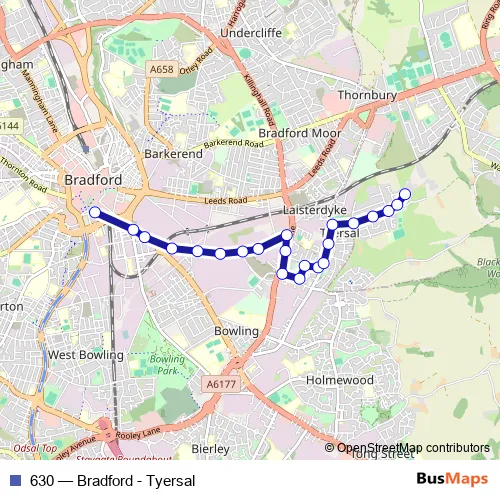 The first stop of the 630 bus route is Bradford Interchange Bus Station and the last stop is Tyersal Crescent. 630 (Bradford - Tyersal) is operational during everyday.