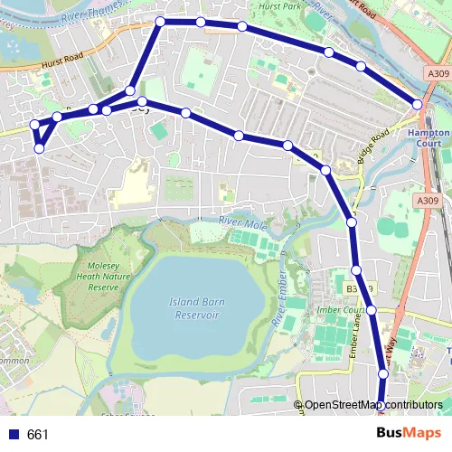 The first stop of the 661 bus route is Weston Green Road and the last stop is Hampton Court Station. 661 is operational during on weekdays.