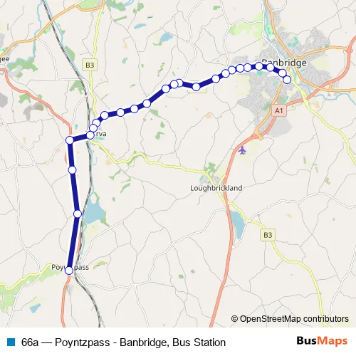 The first stop of the 66a bus route is Banbridge Bus Station and the last stop is Church Street. 66a (Poyntzpass - Banbridge, Bus Station) is operational during on weekdays.