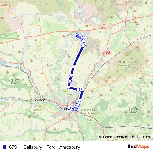 The first stop of the 675 bus route is Library and the last stop is Blue Boar Row. 675 (Salisbury - Ford - Amesbury) is operational during on weekdays.