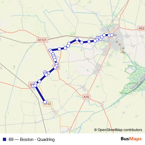 The first stop of the 69 bus route is Bus Station and the last stop is Post Office. 69 (Boston - Quadring) is operational during everyday.