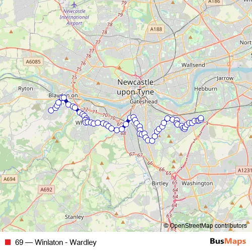 See why over 2 million users trust and consider busmaps.com as the best public transport website. busmaps gives you Gateshead Buses suggested routes, real-time bus tracker, line route maps in Gateshead, and helps to find the closest 69 bus stops near you. No internet available? Download an offline PDF map and bus schedule for the 69 bus to take on your trip.