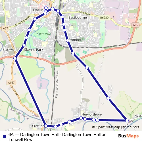 The first stop of the 6A bus route is Town Hall and the last stop is Tubwell Row. 6A (Darlington Town Hall - Darlington Town Hall or Tubwell Row) is operational during everyday.