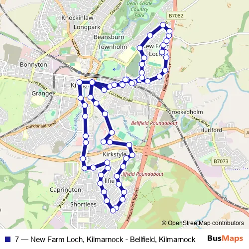 The first stop of the 7 bus route is Kilmarnock Bus Station and the last stop is Kilmarnock Bus Station. 7 (New Farm Loch, Kilmarnock - Bellfield, Kilmarnock) is operational during everyday.