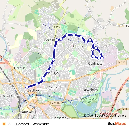 The first stop of the 7 bus route is Milburn Road and the last stop is Bus Station. 7 (Bedford - Woodside) is operational during everyday.
