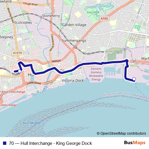 The first stop of the 70 bus route is Hull Interchange and the last stop is NSF Rotterdam Terminal. 70 (Hull Interchange - King George Dock) is operational during everyday.