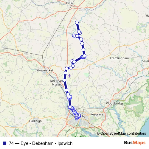 The first stop of the 74 bus route is Railway Station and the last stop is Town Hall. 74 (Eye - Debenham - Ipswich) is operational during everyday.
